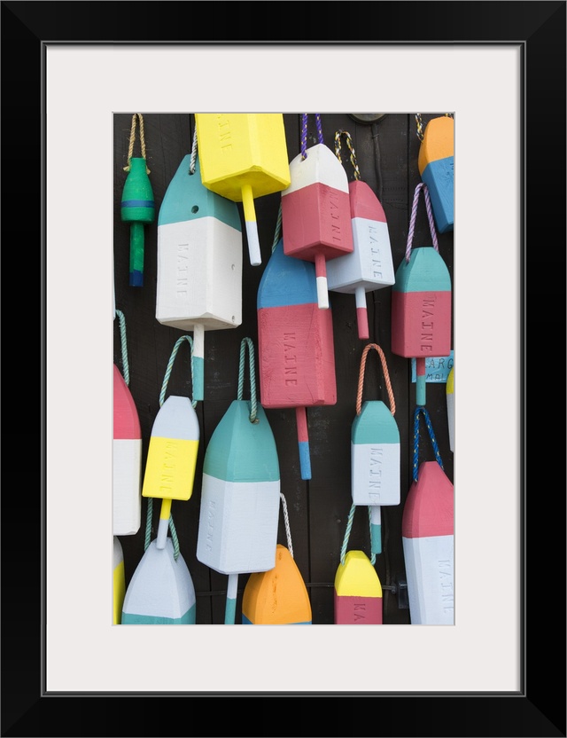 <p>Bar Harbor Maine colorful buoys on wall for sale and state specialty souvenirs for lobster traps catching fishing</p>