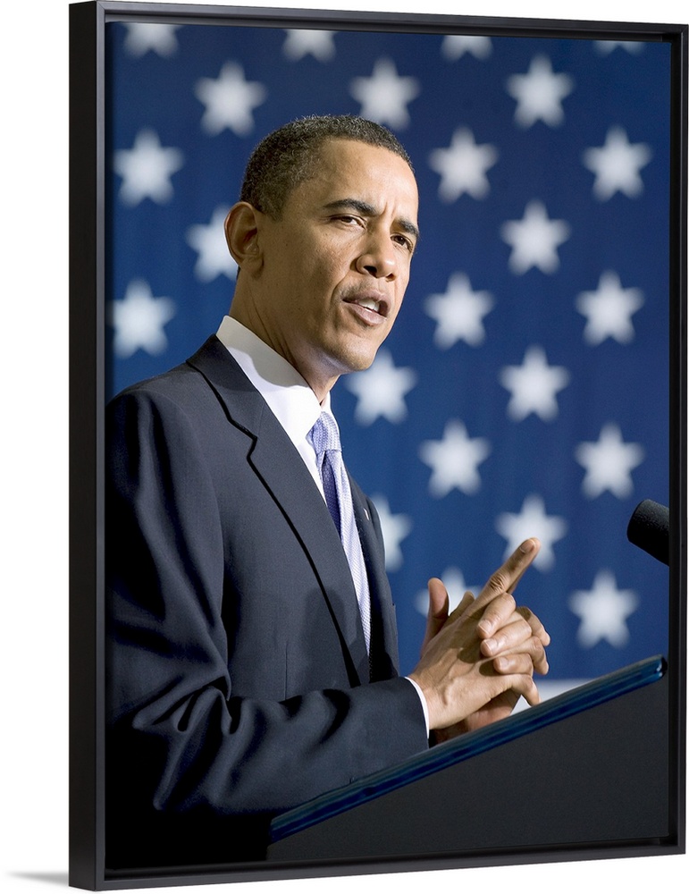 <p>BARACK OBAMA (1961- ). 44th President of the United States. President Barack Obama delivering a speech at the Operations and Checkout Building at Kennedy Space Center in Cape Canaveral, Florida. Photograph, 15 April 2010.</p>