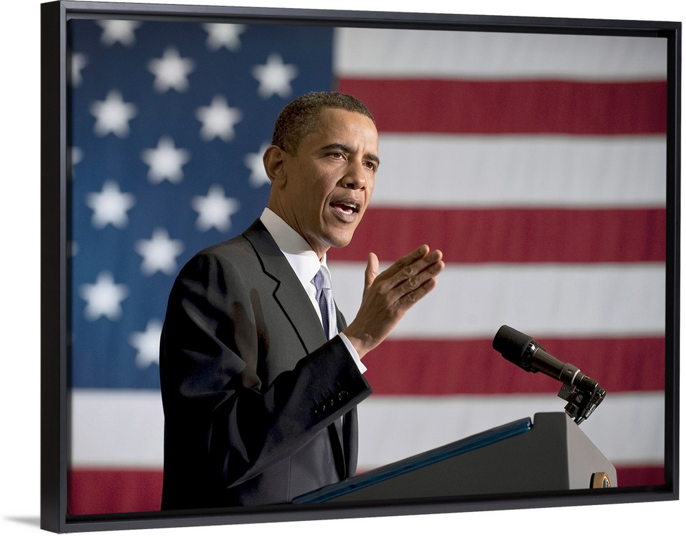 <p>BARACK OBAMA (1961- ). 44th President of the United States. President Barack Obama delivering a speech at the Operations and Checkout Building at Kennedy Space Center in Cape Canaveral, Florida. Photograph, 15 April 2010.</p>