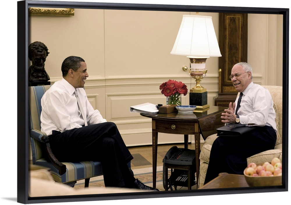 <p>BARACK OBAMA (1961- ). 44th President of the United States. President Obama meeting with former Secretary of State Colin Powell in the Oval Office. Photograph, 15 May 2009.</p>