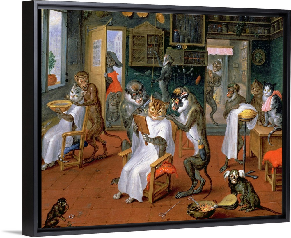 <p>XAM70743 Barber's shop with Monkeys and Cats (oil on copper) by Teniers, Abraham (1629-70); 24x31 cm; Kunsthistorisches Museum, Vienna, Austria; Flemish, out of copyright</p>