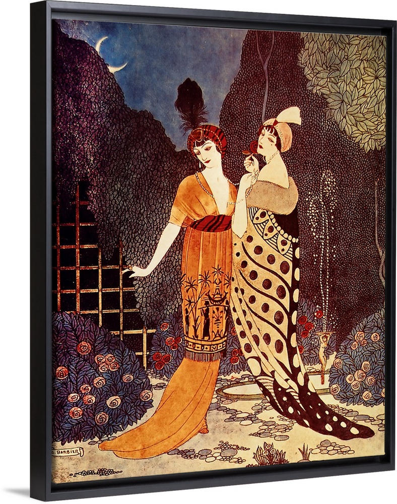 <p>Artwork of a vintage fashion illustration of women displaying elaborate dresses outdoors under a crescent moon.</p>