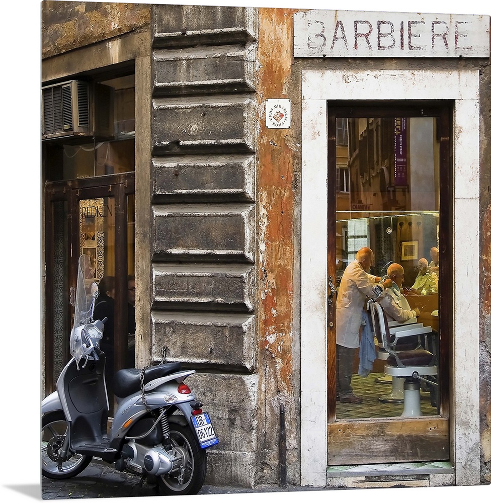 <p>A scooter outside of a barbershop in Italy.</p>