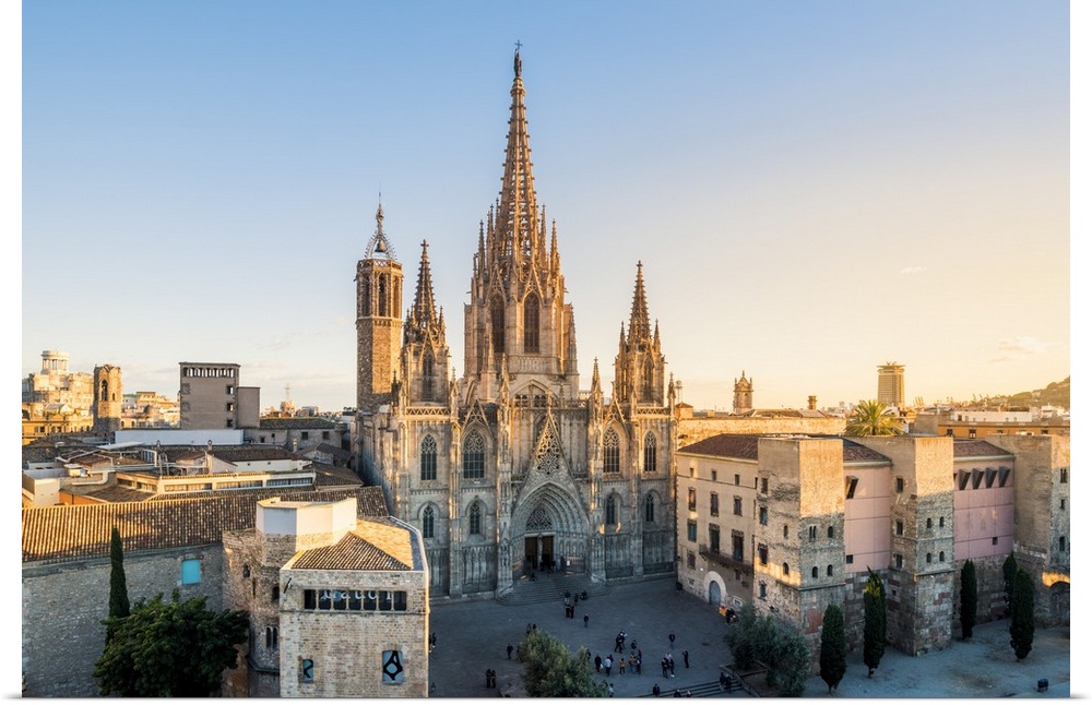 <p>Barcelona, Catalonia, Spain, Southern Europe. High angle view of the old Cathedral of the Holy Cross and Saint Eulalia at sunset.</p>