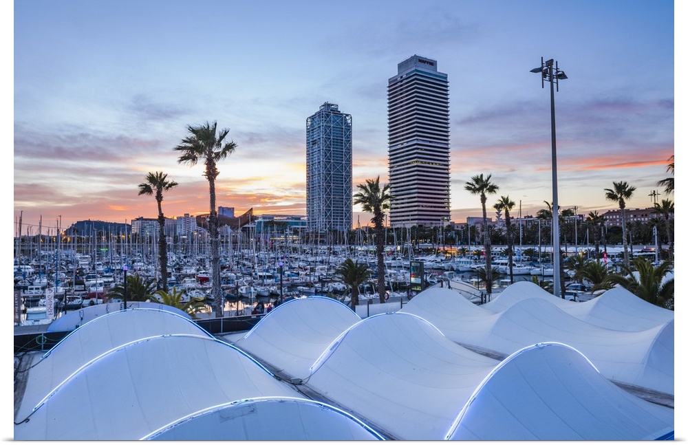 <p>Barcelona, Catalonia, Spain, Southern Europe. The twin towers of Mapfre Tower and Hotel Art at dusk.</p>