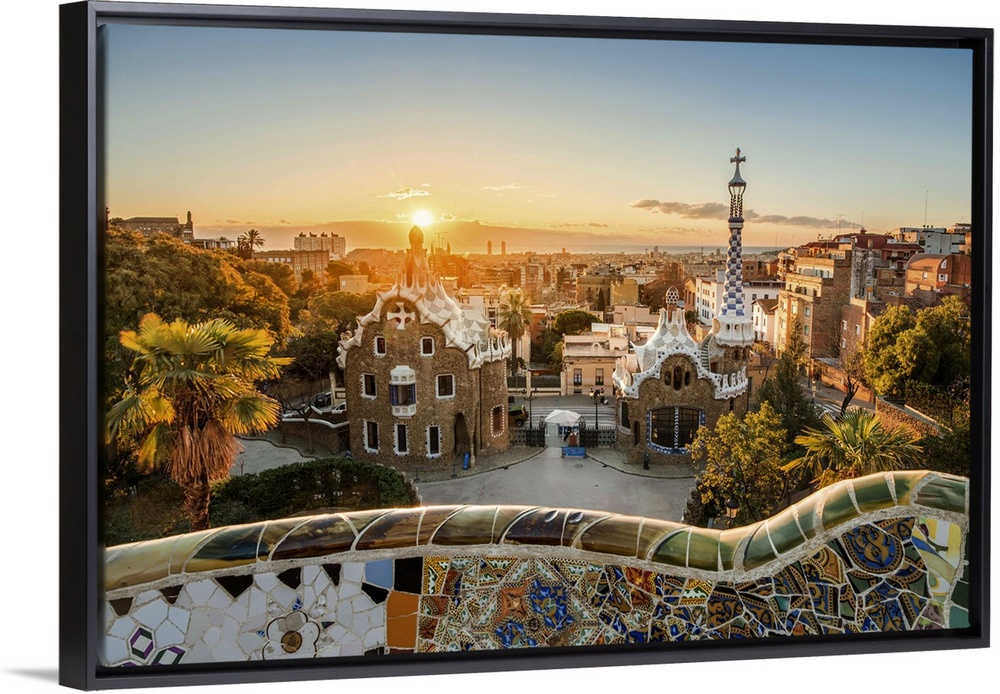 <p>Barcelona, Catalonia, Spain, Southern Europe. Unique Antoni Gaudi's architecture of Park Guell at sunrise.</p>