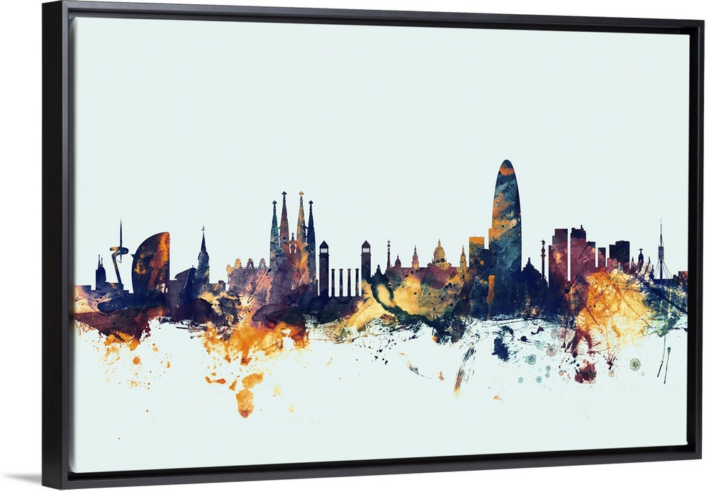 <p>Dark watercolor silhouette of the Barcelona city skyline against a light blue background.</p>