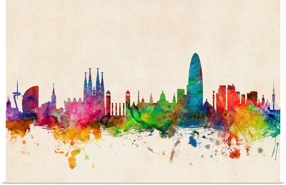 <p>Contemporary piece of artwork of the Barcelona skyline made of colorful paint splashes.</p>