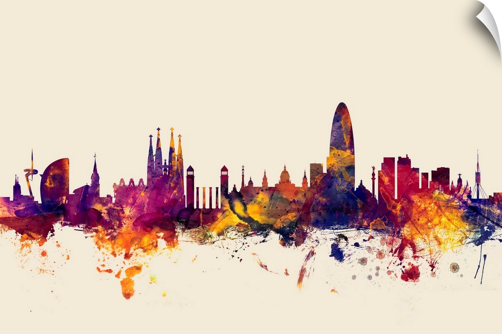 <p>Contemporary artwork of the Barcelona city skyline in watercolor paint splashes.</p>