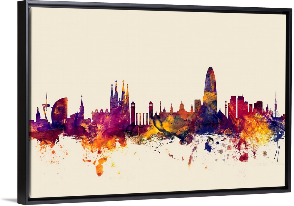 <p>Contemporary artwork of the Barcelona city skyline in watercolor paint splashes.</p>