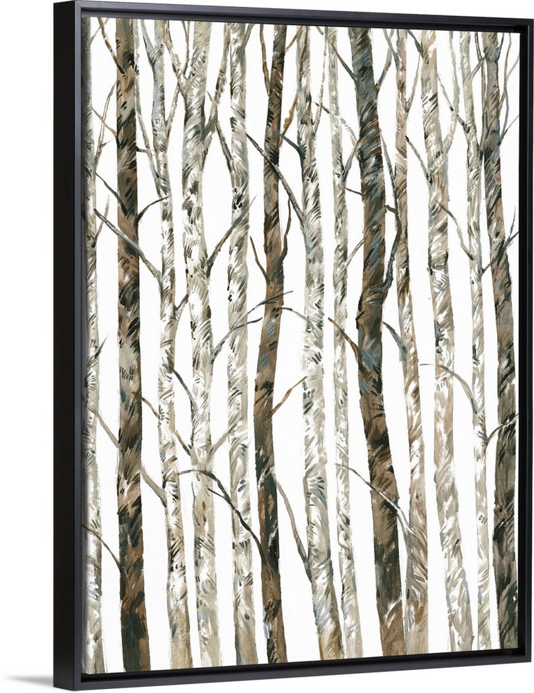 <p>Contemporary monotone painting of a forest of thin trees in the winter, contrasting with the light sky.</p>