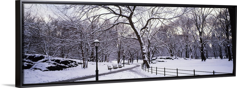 <p>Panoramic photograph of snow covered park. There are benches, trees, a wooden fence and snow-cleared walkway.</p>