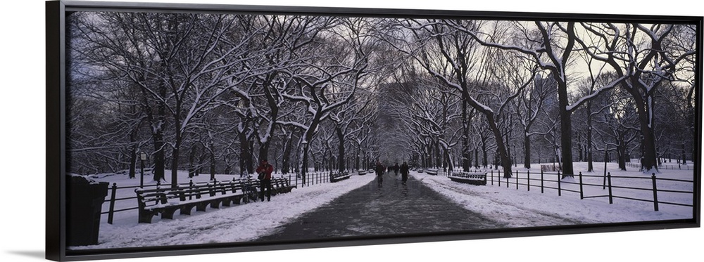 <p>Panoramic view of a cold, snowy walkway through Manhattan central park in New York.</p>