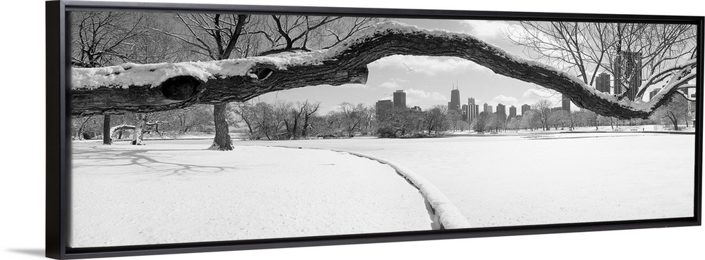 <p>Large panoramic photograph of a snow covered tree branch close up with snow on the ground and the Chicago skyline in the background.</p>