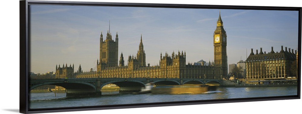 <p>Panoramic photograph of the London skyline, including Big Ben. In the foreground, a barge in the Thames River is about to pass beneath the Westminster Bridge.</p>