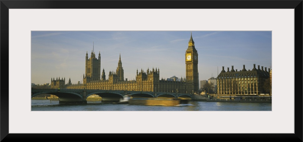 <p>Panoramic photograph of the London skyline, including Big Ben. In the foreground, a barge in the Thames River is about to pass beneath the Westminster Bridge.</p>