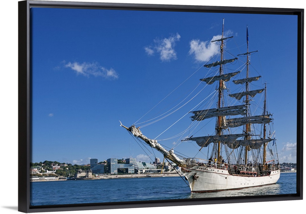<p>The 56 meter, 3 mast Dutch tall ship Bark Europa, prepares to set sail from the harbour of Cascais with the town of monte Estoril in the background, Albatroz, Abuxarda, Lisbon, Lisboa, Portugal.</p>