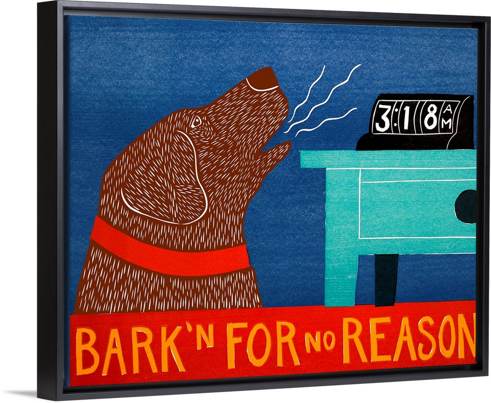<p>Illustration of a chocolate lab "Bark'n For No Reason" at 3:18am.</p>