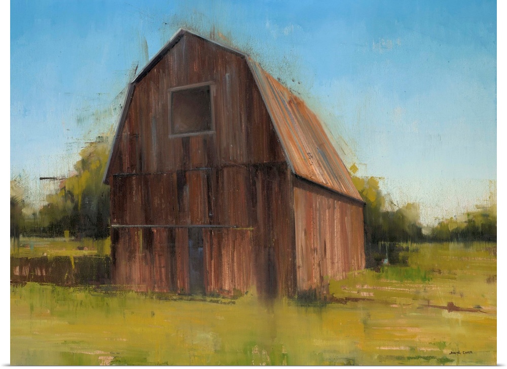 <p>Contemporary painting of a tall wooden barn in a country landscape.</p>