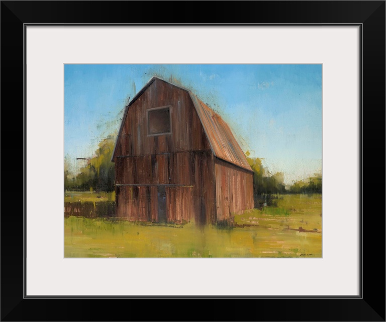 <p>Contemporary painting of a tall wooden barn in a country landscape.</p>