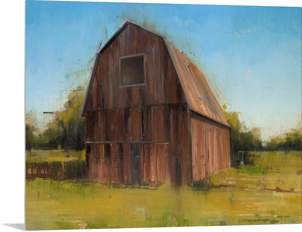 <p>Contemporary painting of a tall wooden barn in a country landscape.</p>