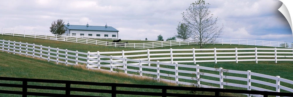 <p>Horse corral fences and barn in Kentucky. In Lebanon, KY a hillside of white and black fences of horse corrals and horse barn.</p>