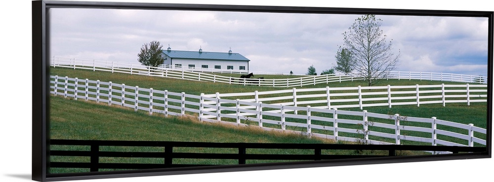 <p>Horse corral fences and barn in Kentucky. In Lebanon, KY a hillside of white and black fences of horse corrals and horse barn.</p>