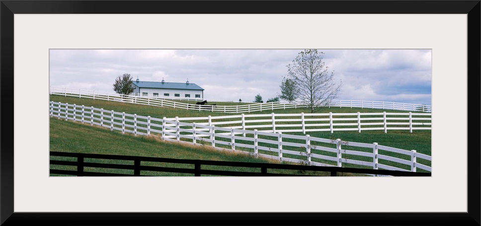 <p>Horse corral fences and barn in Kentucky. In Lebanon, KY a hillside of white and black fences of horse corrals and horse barn.</p>