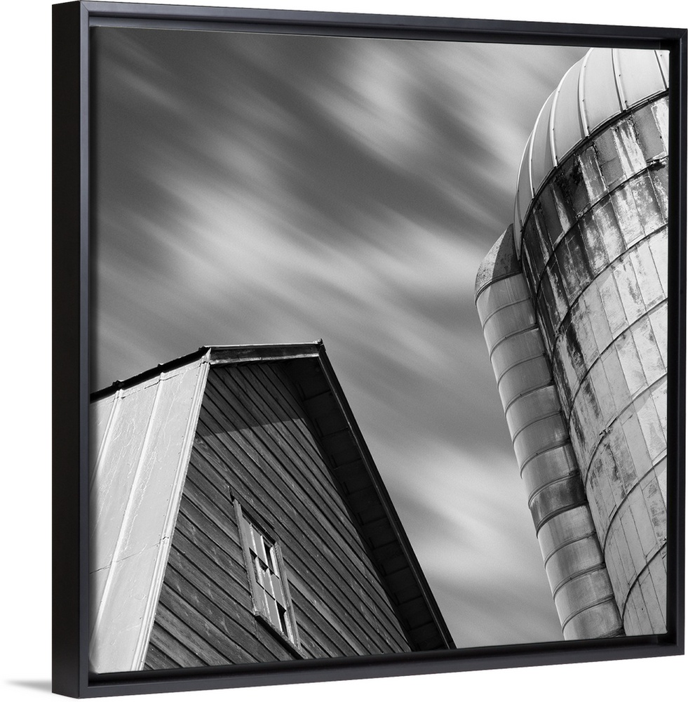 <p>A black and white image of a barn and silo with a blurred clouded sky.</p>