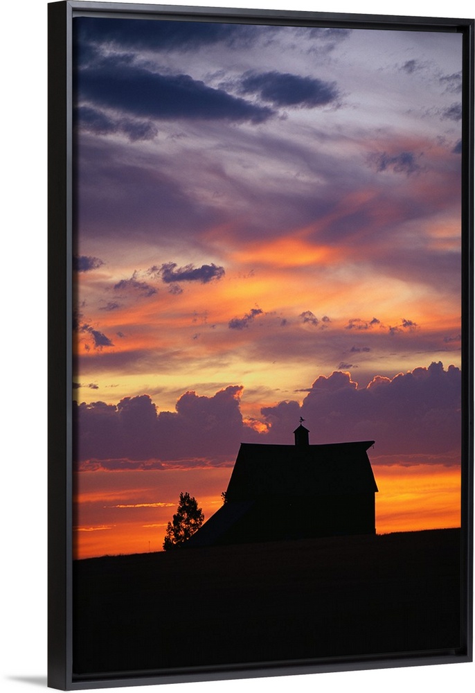 <p>Vertical panoramic photograph of farm house silhouette at dusk under a cloudy and colorful sky.</p>