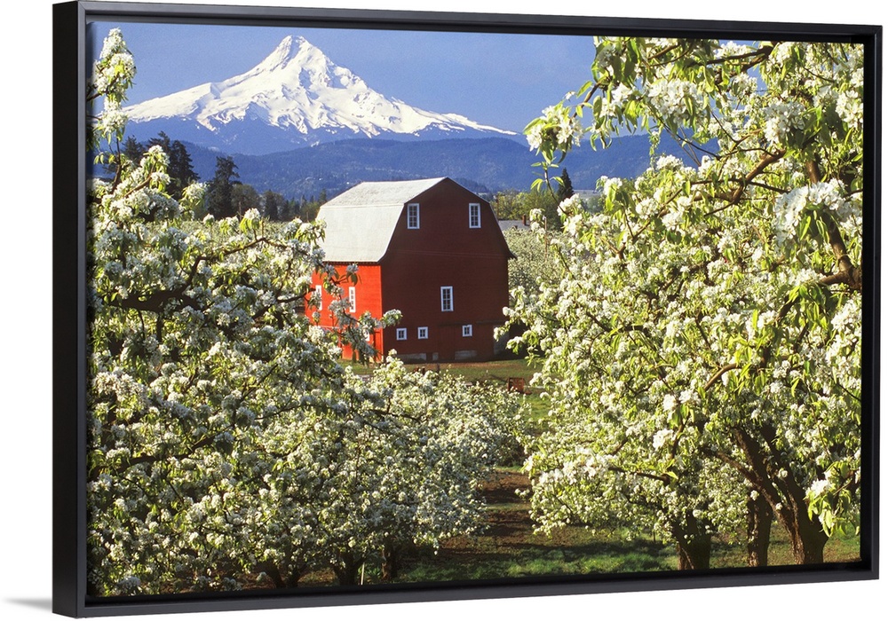<p>Red barn in a blooming pear orchard below Mt. Hood in the Hood River Valley, Oregon.</p>