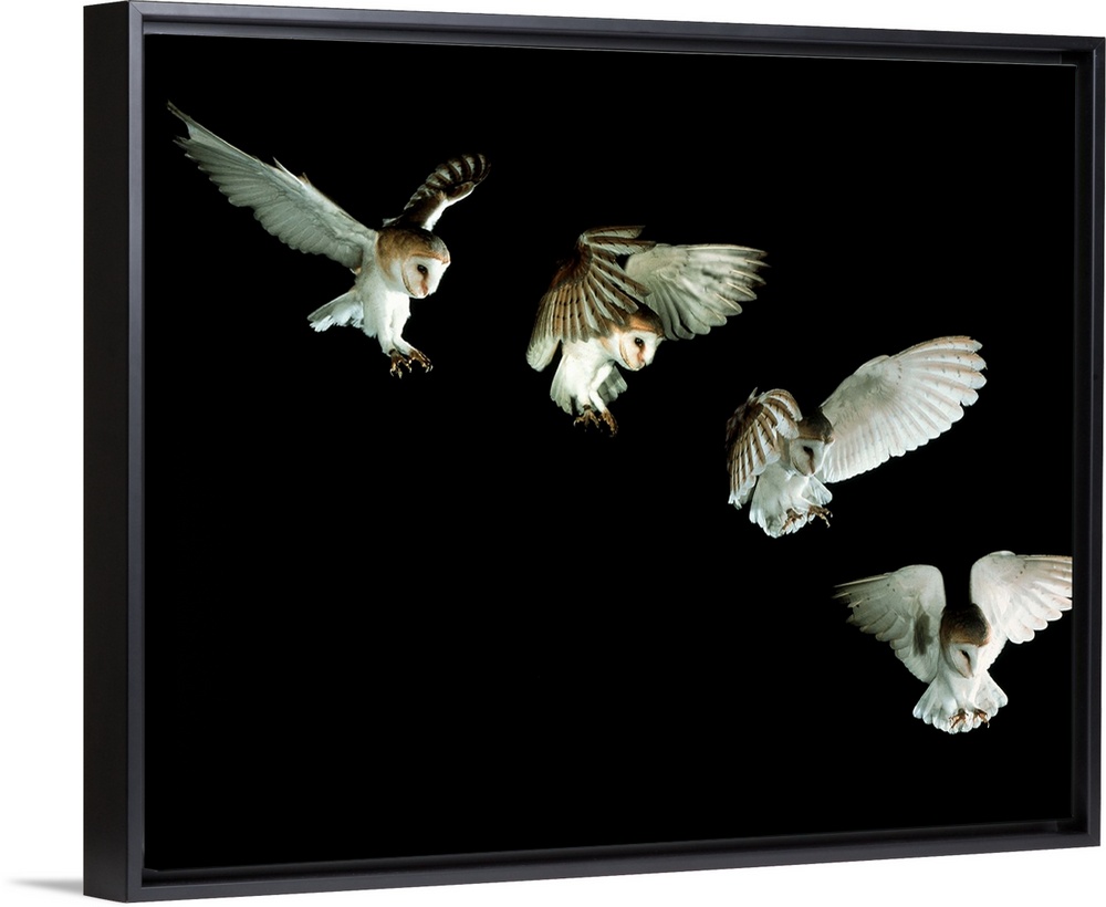 <p>Barn owl. Composite image of high-speed photographs of a European barn owl (Tyto alba) swooping from the air to capture its prey (not seen). The barn owl has long pointed wings with a span of 95 centimetres. It is a nocturnal predator, hunting for small mammals and insects on the wing in open country. The flight of the barn owl is almost silent because of the arrangement of the flight feathers on its wings. When hunting it relies mostly on its acute hearing, which it uses to sense the movement of its prey on the ground before swooping down and grasping the victim with its sharp talons.</p>