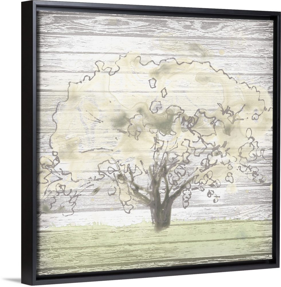 <p>Creative artwork of a faded tree and grass on a weathered white wood plank background.</p>