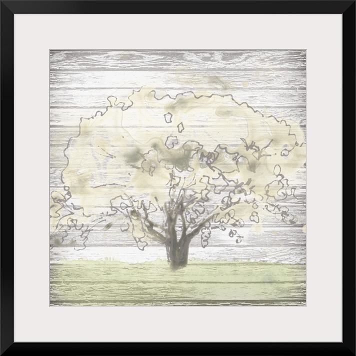 <p>Creative artwork of a faded tree and grass on a weathered white wood plank background.</p>