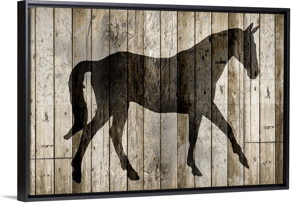 <p>A silhouette of a horse on a rustic wood paneled background.</p>