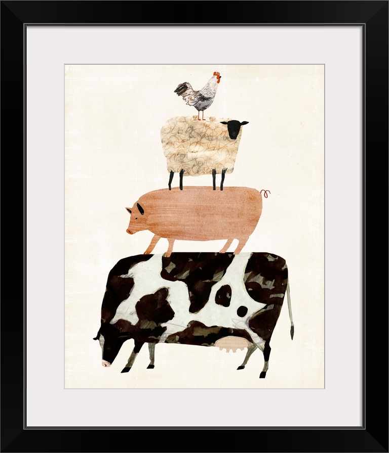 <p>A pyramid of sketched and drawn farm animals fill the neutral distressed background in this decorative folk art.</p>