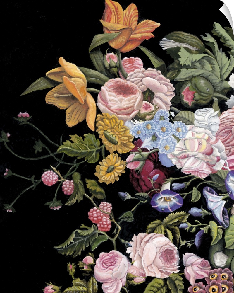 <p>Vintage style art print of a stunning bouquet of flowers of various types on black.</p>