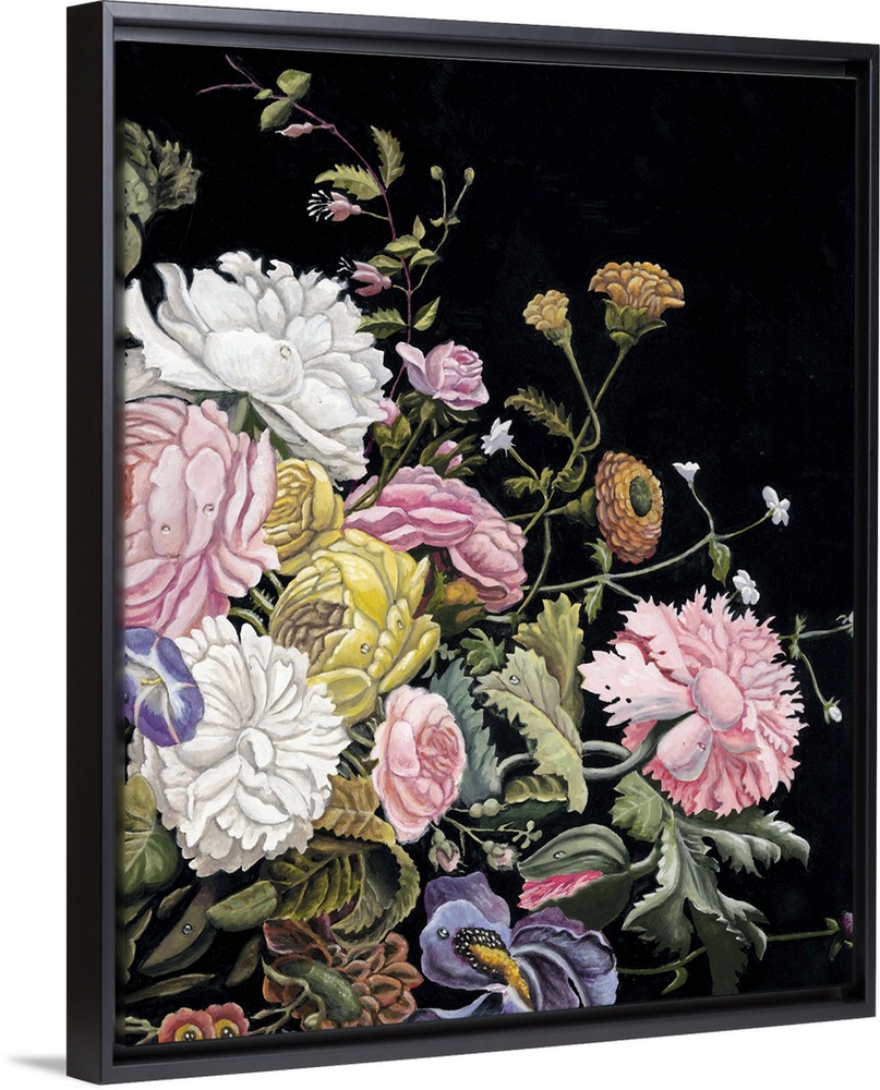<p>Vintage style art print of a stunning bouquet of flowers of various types on black.</p>