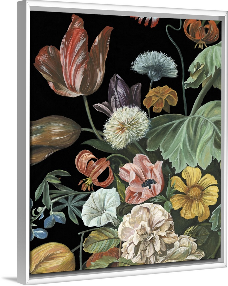 <p>Vertical contemporary artwork featuring flowers surrounded by rich greenery against a black background.</p>