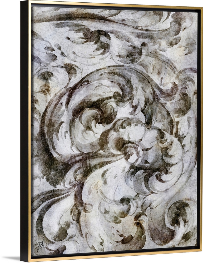 <p>A simple watercolor sketch of a baroque architectural scroll in shades of grey.</p>