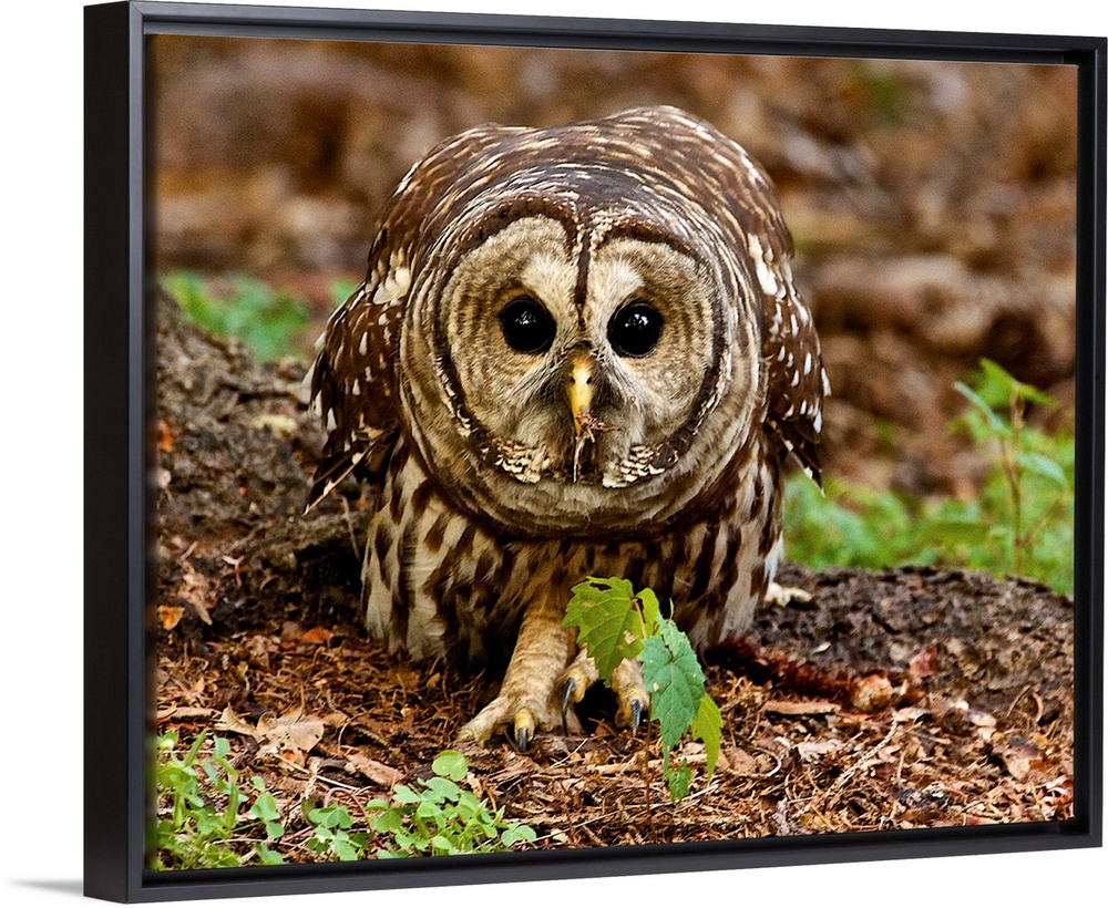 <p>A Barred Owl on the ground, in a defensive posture.</p>