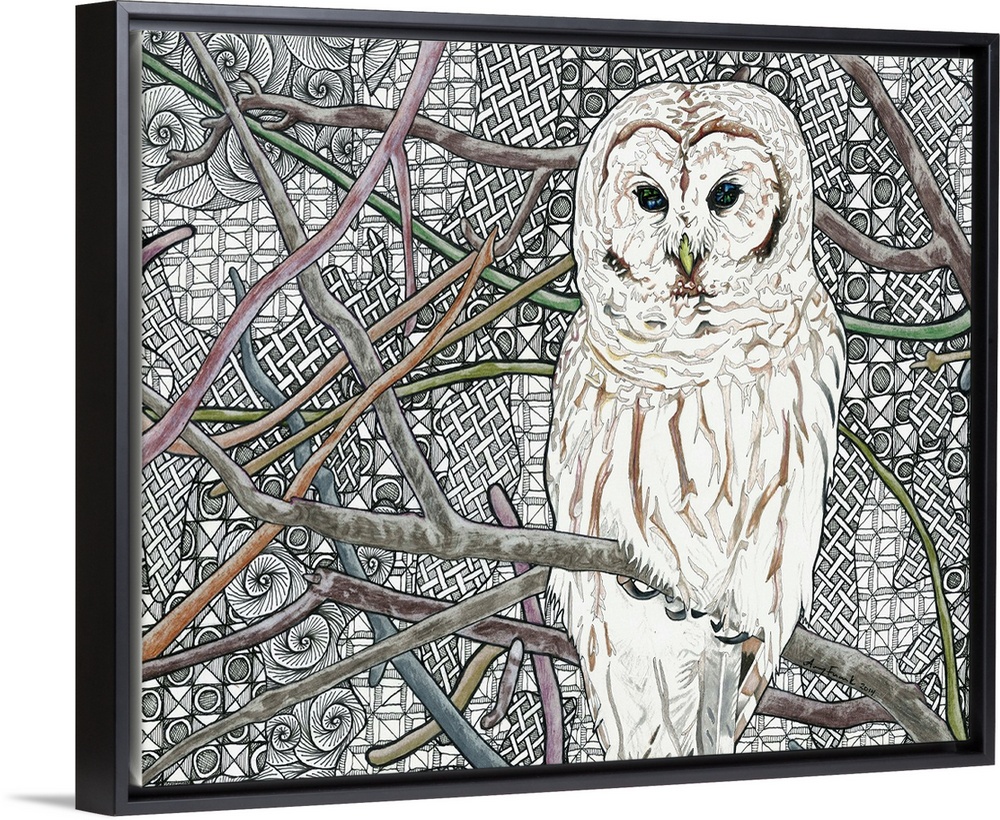 <p>Illustration of a white owl with brown markings on a branch with colorful branches all around and a black and white background with different patterns.</p>