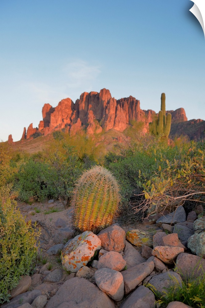 <p>USA, Arizona, Lost Dutchman State Park, Barrel Cactus in front of the Superstition Mountains.</p>