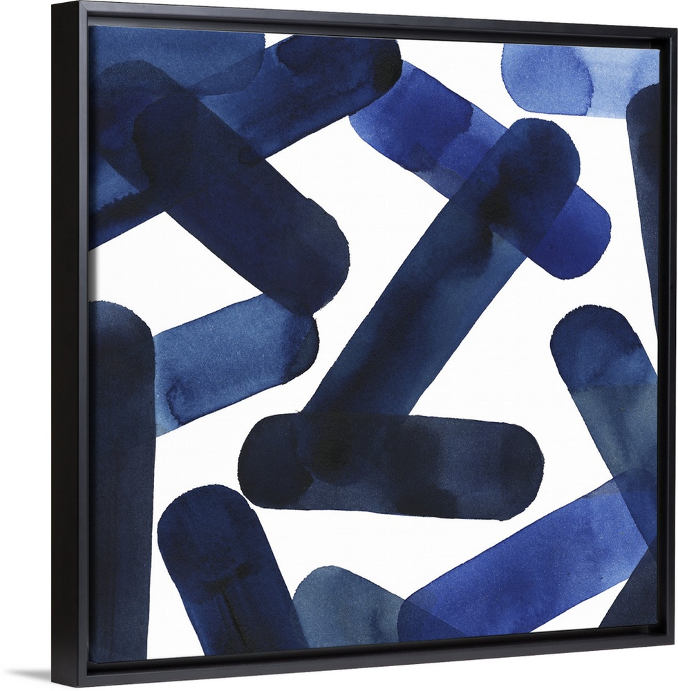 <p>Square abstract of blue elongated shapes falling over a white background.</p>
