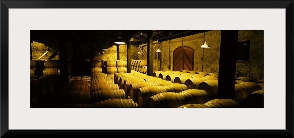 <p>Large, landscape photograph of a partially lit cellar with stone walls, full of wine barrels, in Mt. Veeder, Napa Valley, California.</p>