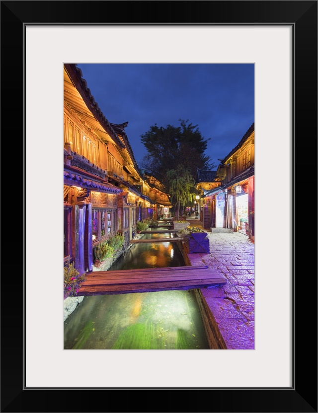 <p>Bars and restaurants along canal at dusk, Lijiang, Yunnan, China</p>