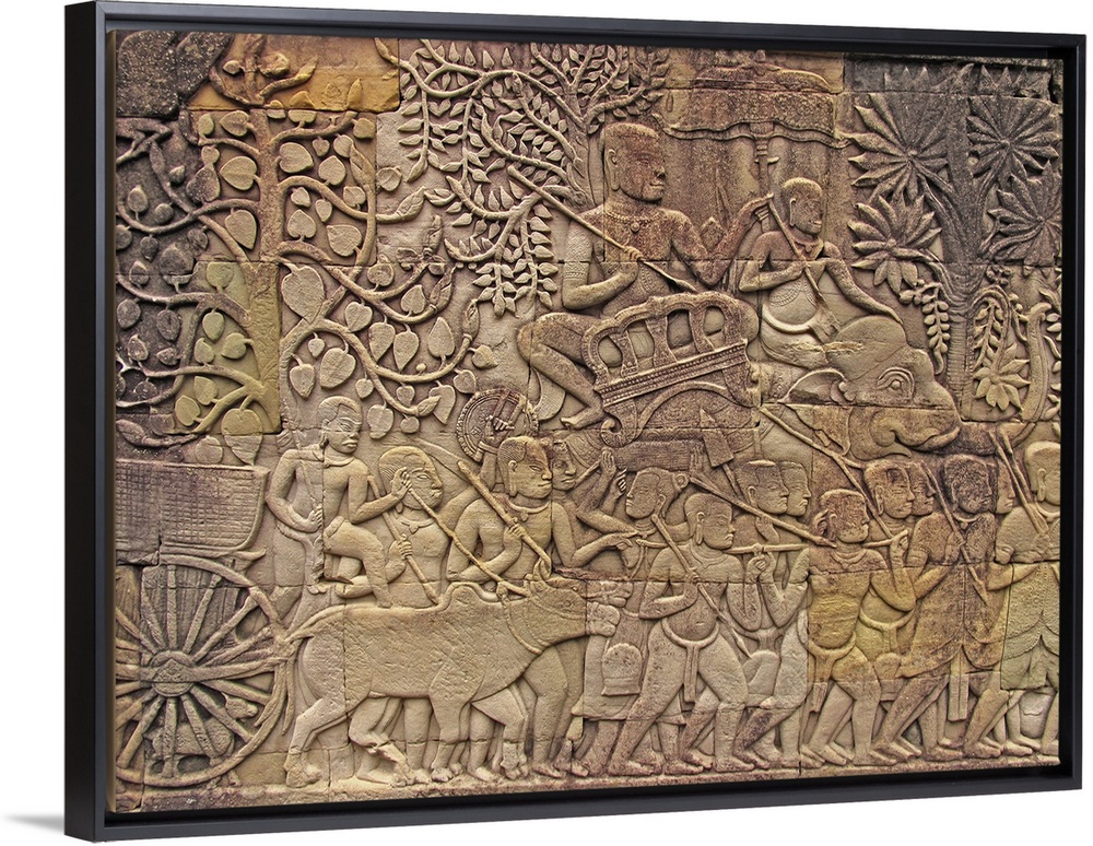 <p>Bas-relief depicting a narrative scene. This carving is at Angkor Wat, a 12th century temple in Cambodia. The temple was originally dedicated to the Hindu god Vishnu.</p>