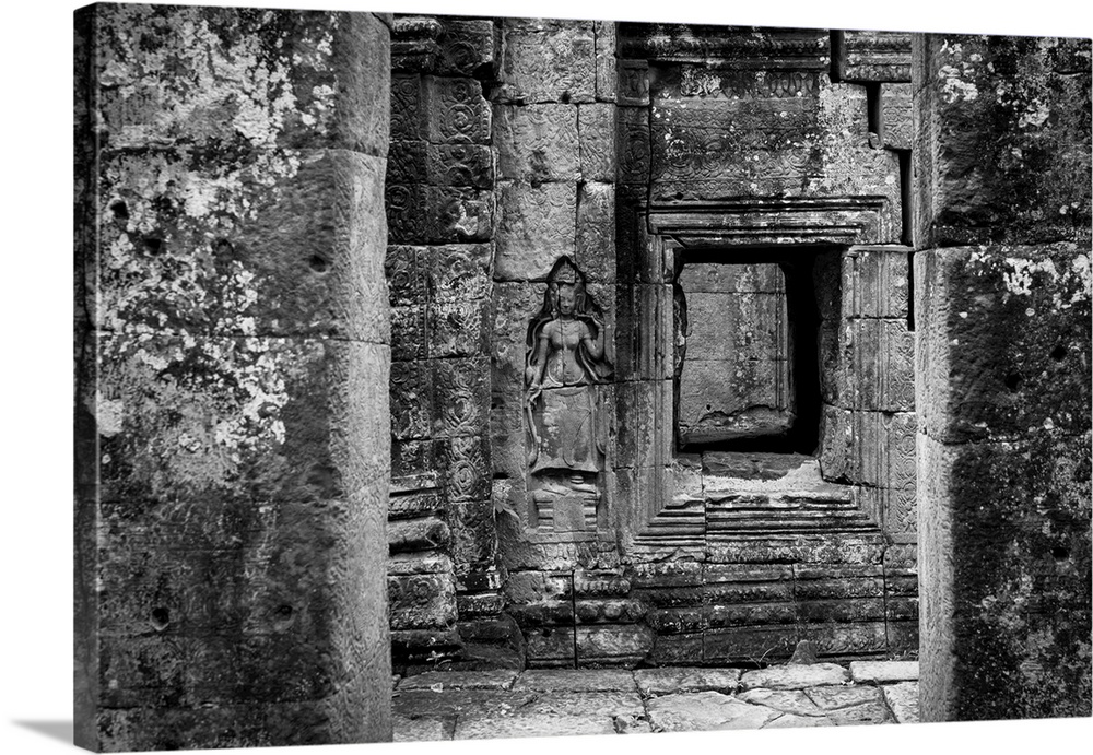 <p>Monochrome bas-relief of crowned woman beside window, Banteay Kdei, Angkor wat, Siem reap, Siem reap province, Cambodia</p>