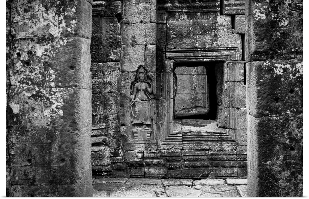 <p>Monochrome bas-relief of crowned woman beside window, Banteay Kdei, Angkor wat, Siem reap, Siem reap province, Cambodia</p>