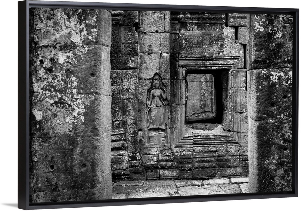 <p>Monochrome bas-relief of crowned woman beside window, Banteay Kdei, Angkor wat, Siem reap, Siem reap province, Cambodia</p>